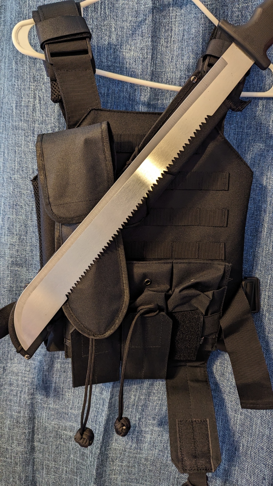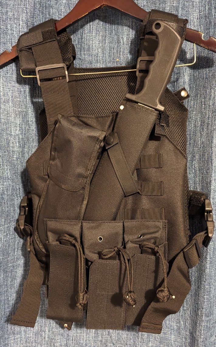 These vests come equipped with a handgun holster, handgun magazine holder (x3), combat knife with holster, heavy duty shears, tactical shovel, machete, large magazine holder (AR-15, M16, or AK-47) and an American Flag! All vests can hold armor plates (10”x12”), but they are not included. If you would like to purchase armor plates, please go to our affiliates page to purchase. Buying direct will save you money! The vests are universal fit and should fit most adults.